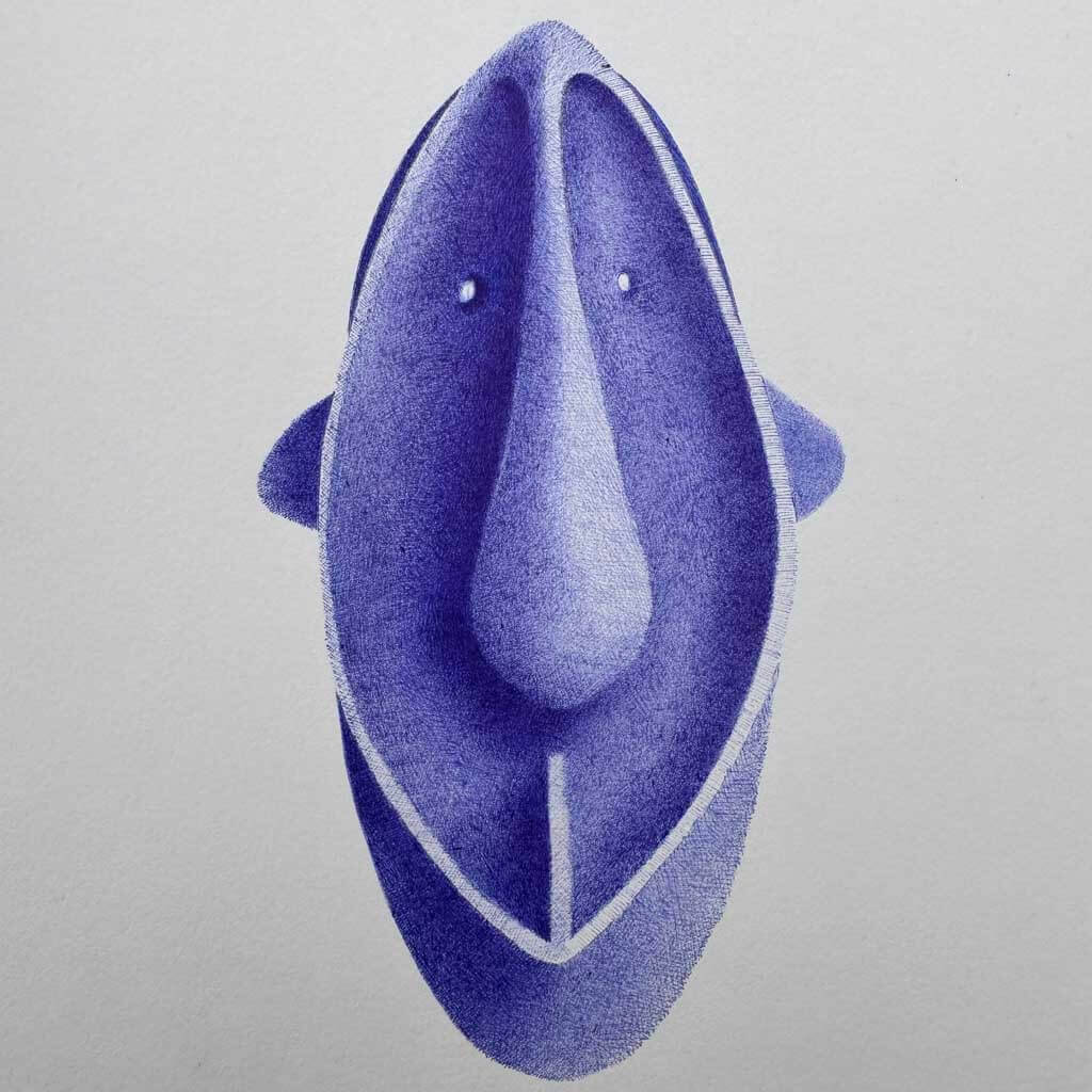 Ce dessin s’inscrit dans une série de dessin préparatoire à une série de masques sculptés. Ce dessin est une pièce unique au stylo bille où chaque surface est remplie d’une texture infinie, révélée par la seule encre bleue.