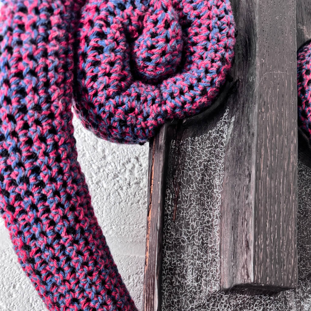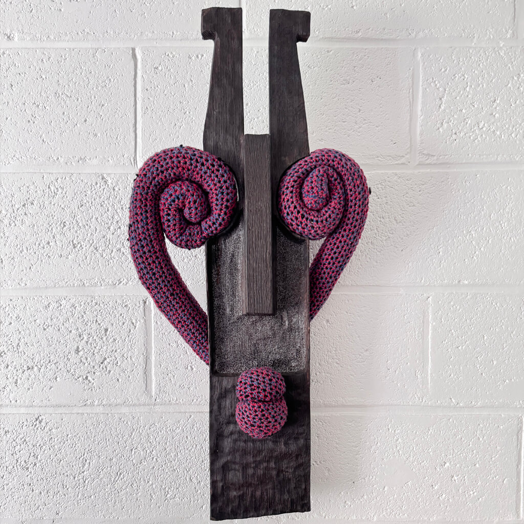 Cette œuvre hybride, “Bois de laine”, dialogue entre le temps et la matière. Elle associe un masque de chêne centenaire d’inspiration africaine* et un colombin de laine crochetée. Les deux éléments, unis par deux simples pointes de charpentier, créent un pont entre l’ancien et le contemporain. La noblesse du bois contraste avec la douceur de la laine, réinventant la puissance évocatrice des masques traditionnels.
