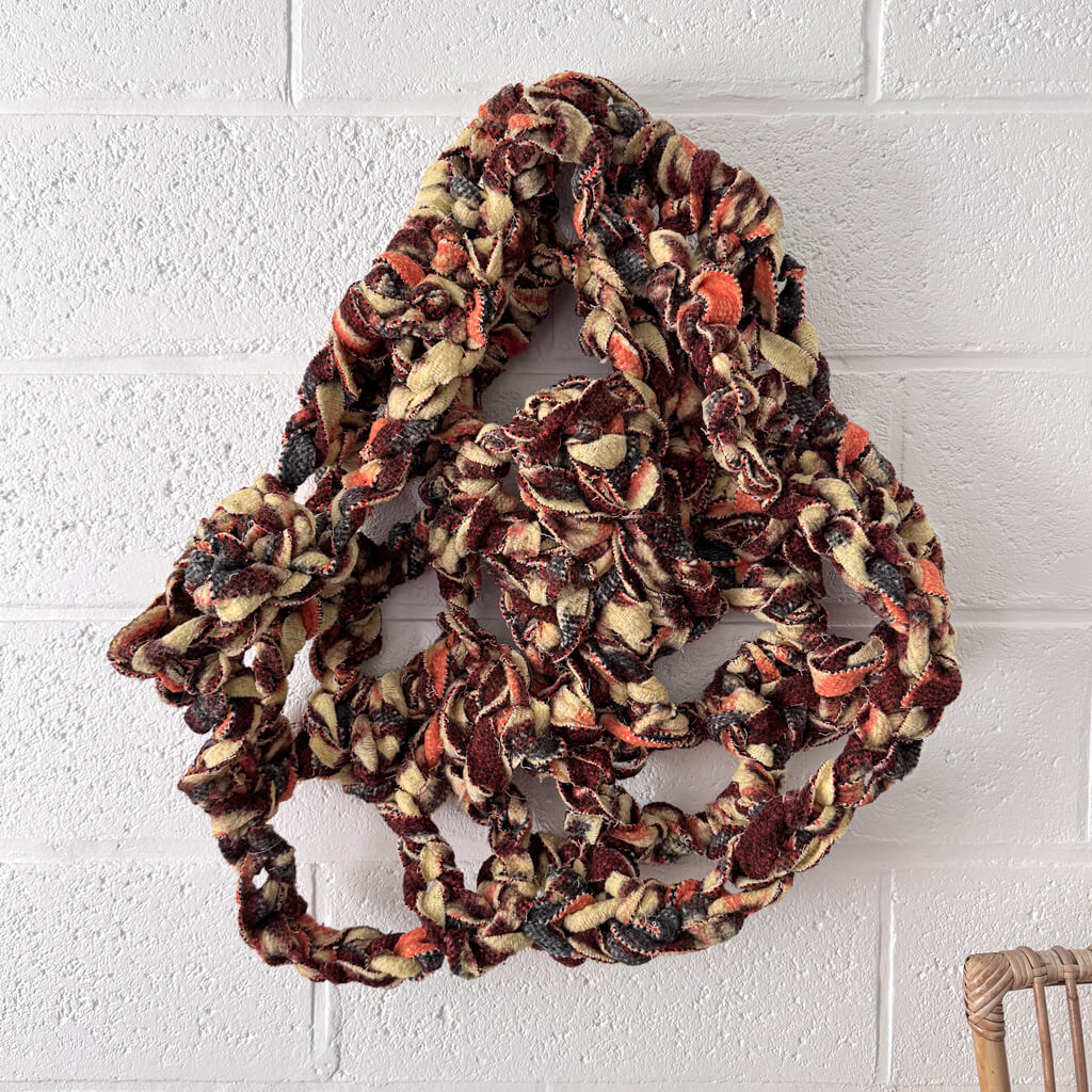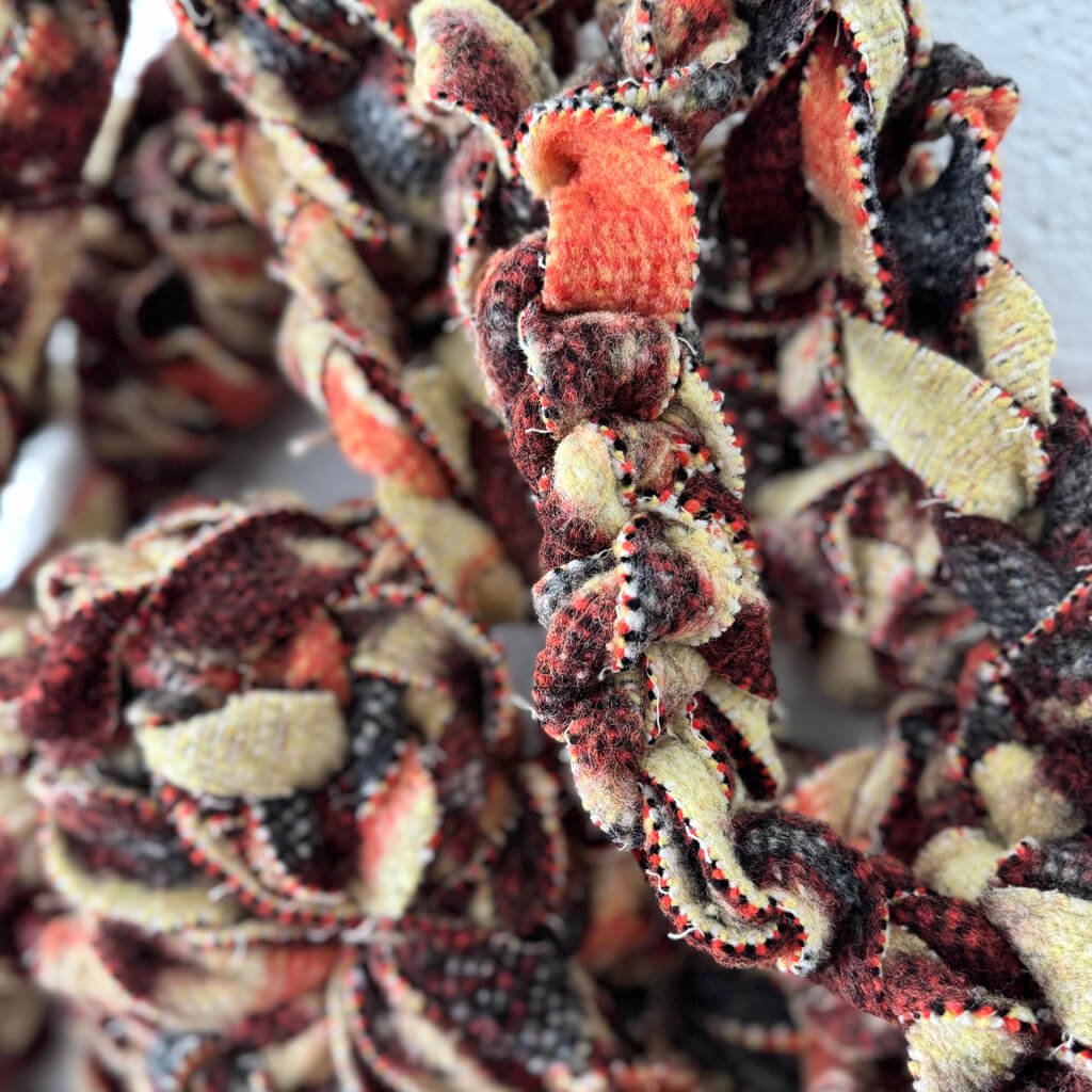 Cette pièce textile, «Corail”, tisse un fil entre le passé et le présent. Elle est née de la transformation d’une couverture ancienne, découpée et crochetée à la main en une chaîne sans fin.Chaque maille est un point de mémoire, où les motifs et les couleurs d’origine se mêlent dans un entrelacs organique. L’œuvre invite à suivre ce lien visuel et tactile, qui retrace la vie d’un textile oublié et la réinvente en une nouvelle poésie plastique.À la fois solide et doux, ce lien devient une sculpture qui dialogue avec l’espace. Il est le symbole de la résilience de la matière et du geste artistique qui la réanime.