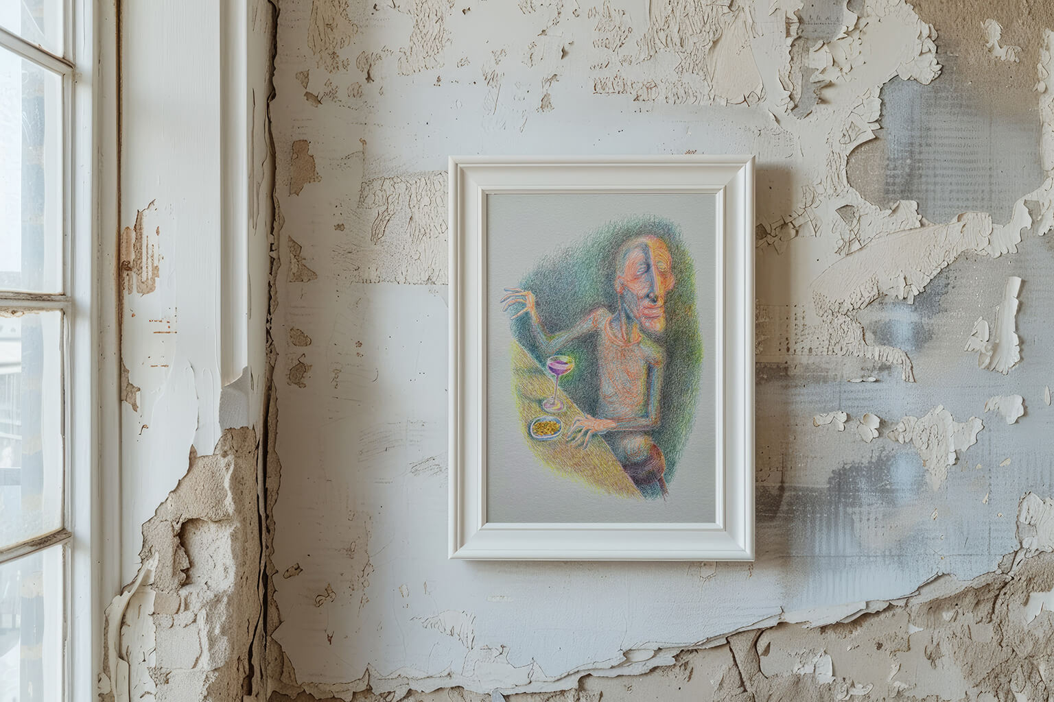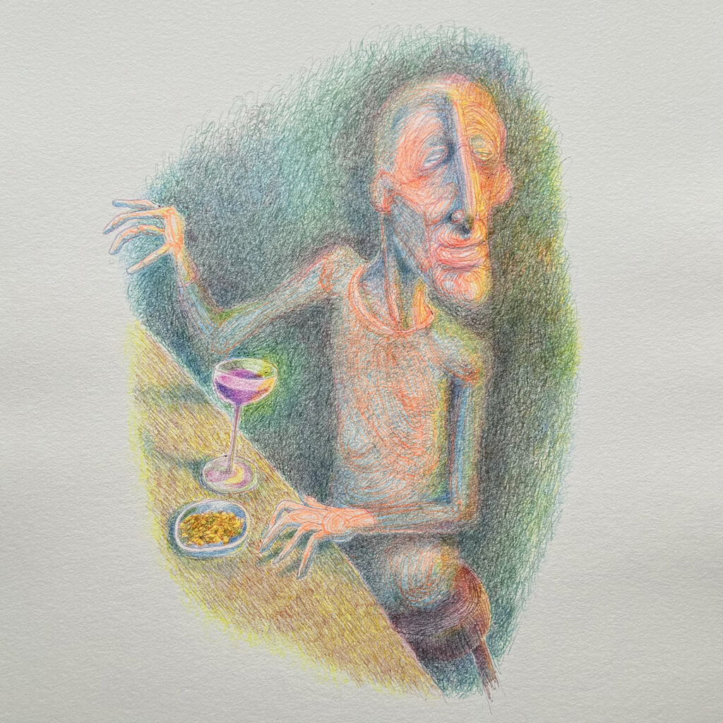 J’aime particulièrement le traitement de ce dessin. Les formes ne sont pas nettes. Le personnage sort de cette masse mais y est comme englué. Un rapport à la solitude et à l’alcool.